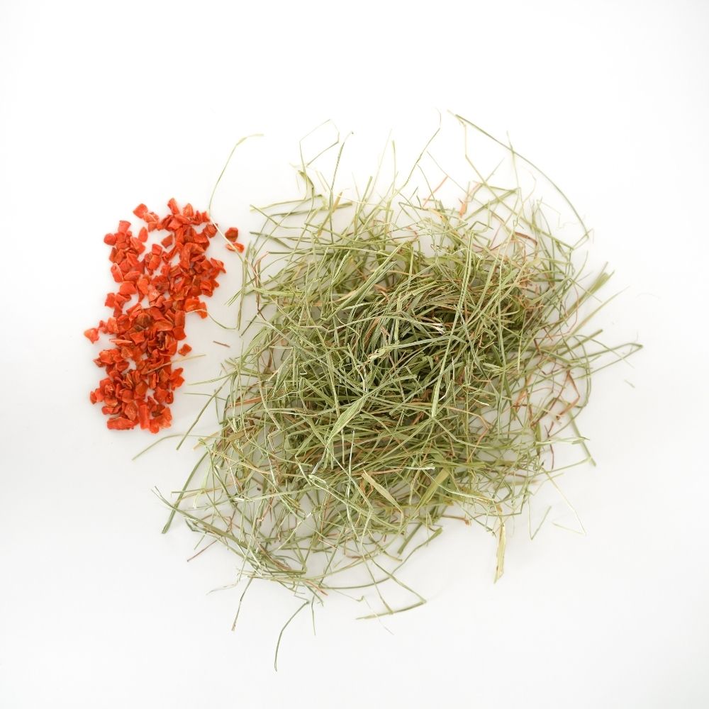 El Heno de Festuca Extra Verde con Zanahoria es una opción nutritiva para conejos y cobayas. Además de ser rico en fibra, la zanahoria aporta antioxidantes y vitaminas A, C y K. Ideal para su uso ilimitado.