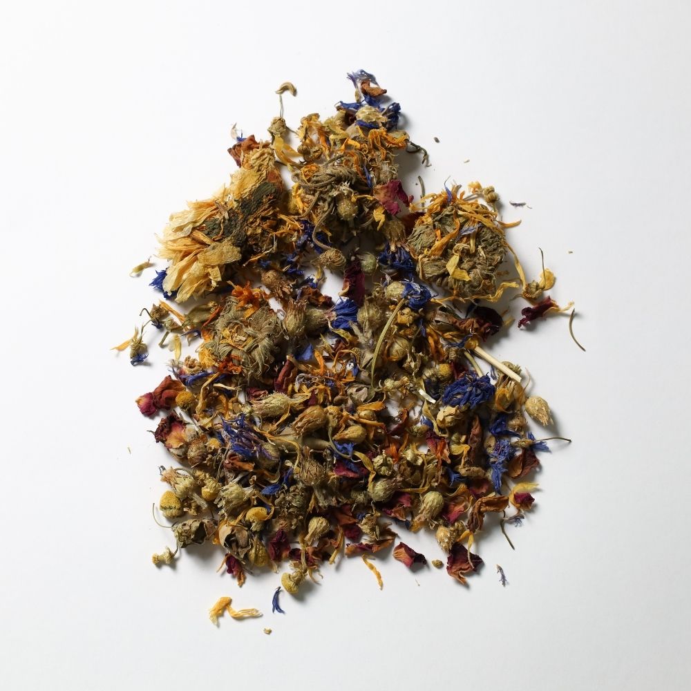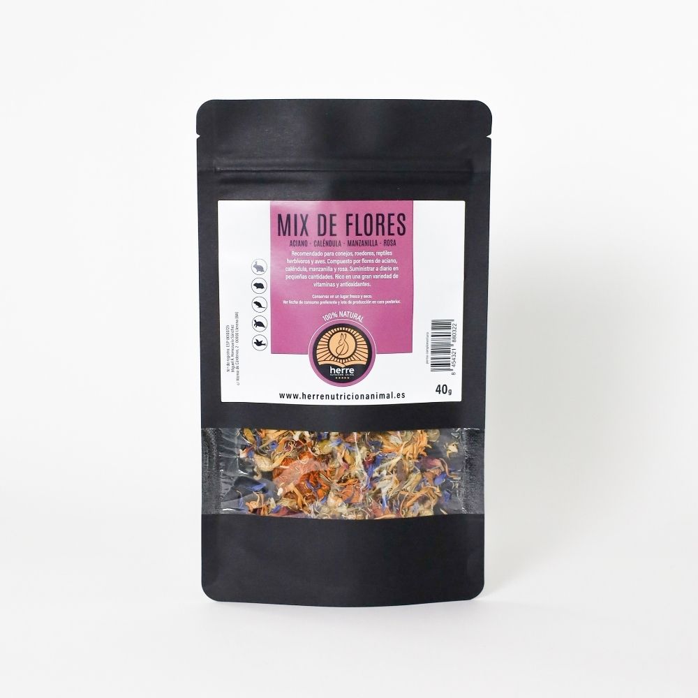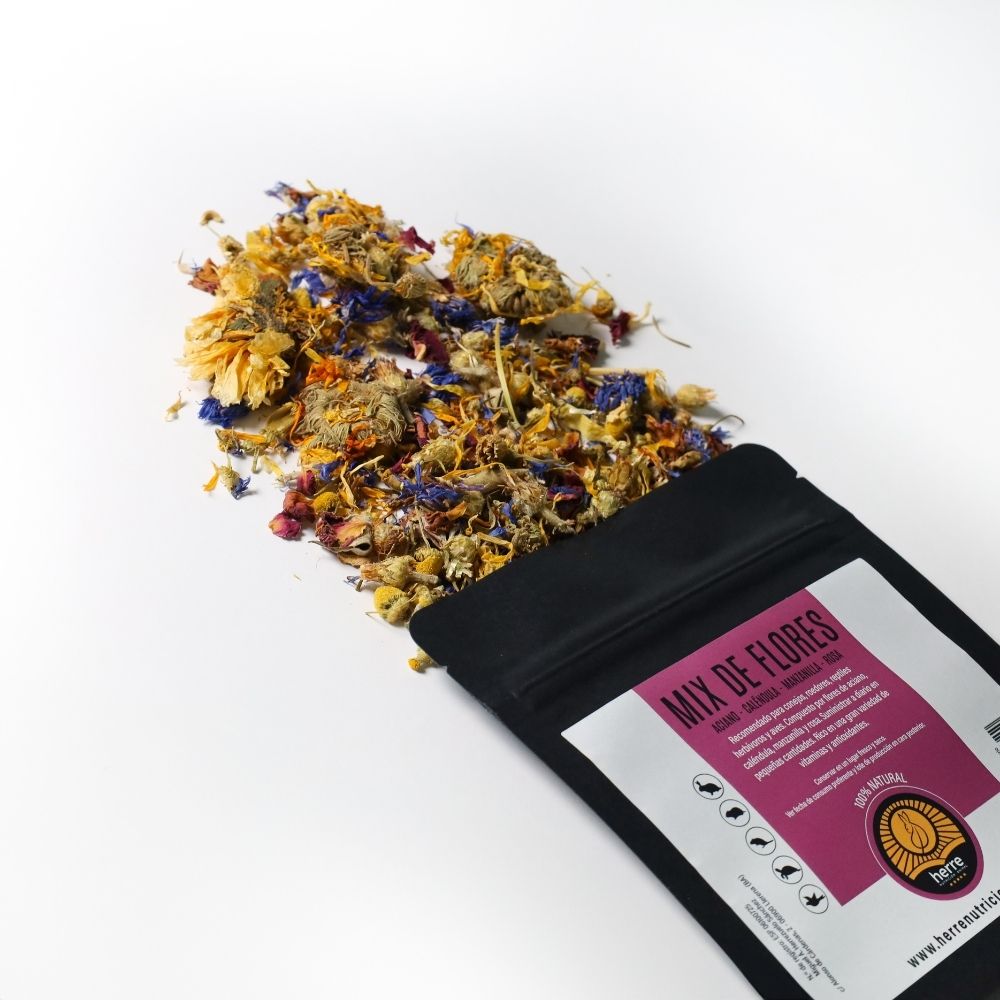 Alimento compuesto por Mix de Flores: aciano, caléndula, manzanilla y rosa.