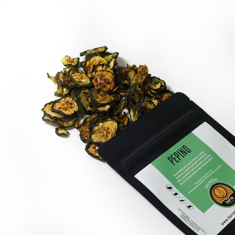 Las rodajas de pepino deshidratadas conservan todos sus nutrientes y sabor, aportando variedad y equilibrio a la dieta. Al ser deshidratadas, son fáciles de almacenar y servir, y puedes suministrarlas diariamente en pequeñas cantidades en el comedero de tu mascota, complementando su dieta de forma natural y equilibrada.